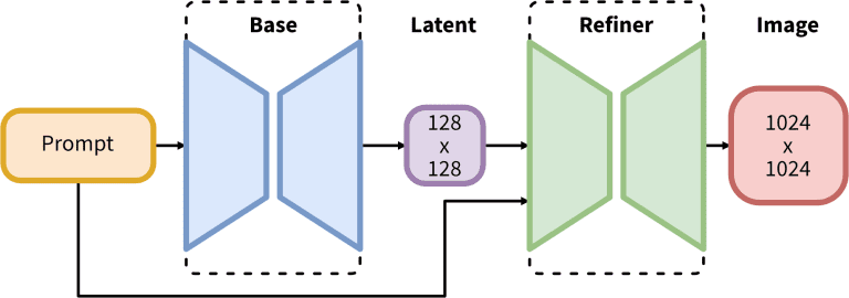Sơ đồ quá trình 2 bước cơ bản và tinh chỉnh của SDXL.